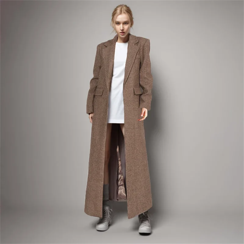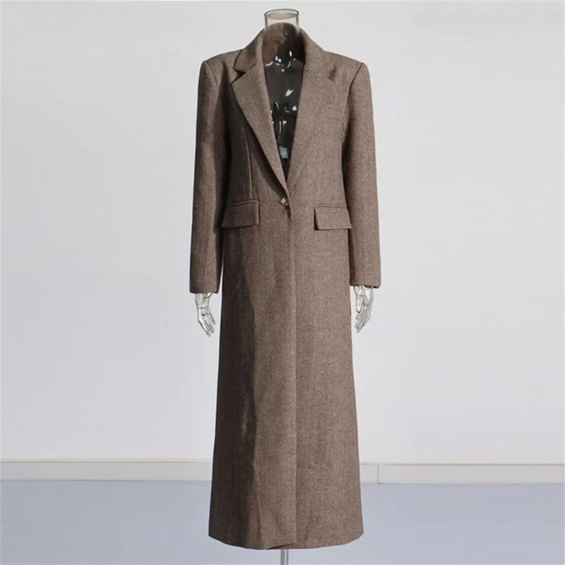 Chevron Long Suit Jacket for Women Long Sleeves Peaked Lapel One Button Camel Women’s Suit Blazer Vintage English Style Coat