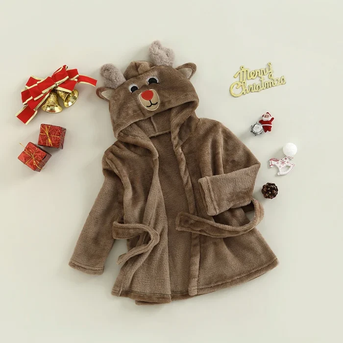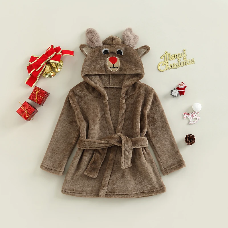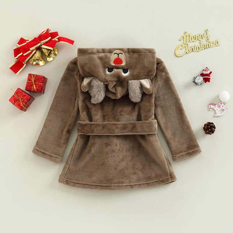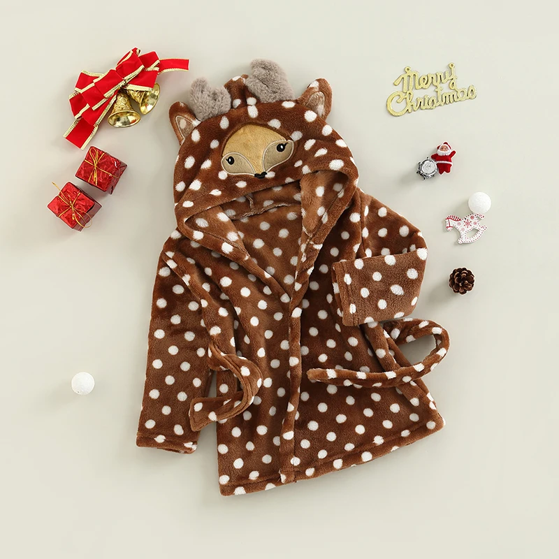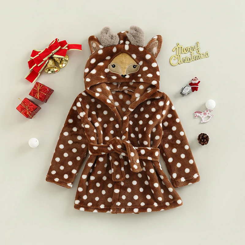 Kids Girls Boys Christmas Bathrobe Cartoon Elk/Fox Dot Pattern Hooded Long Sleeve Robe Sleepwear Pajamas with Belt