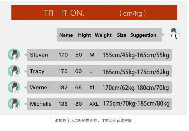 Do not know the choice of size can contact customer service at any time for your suggestions.