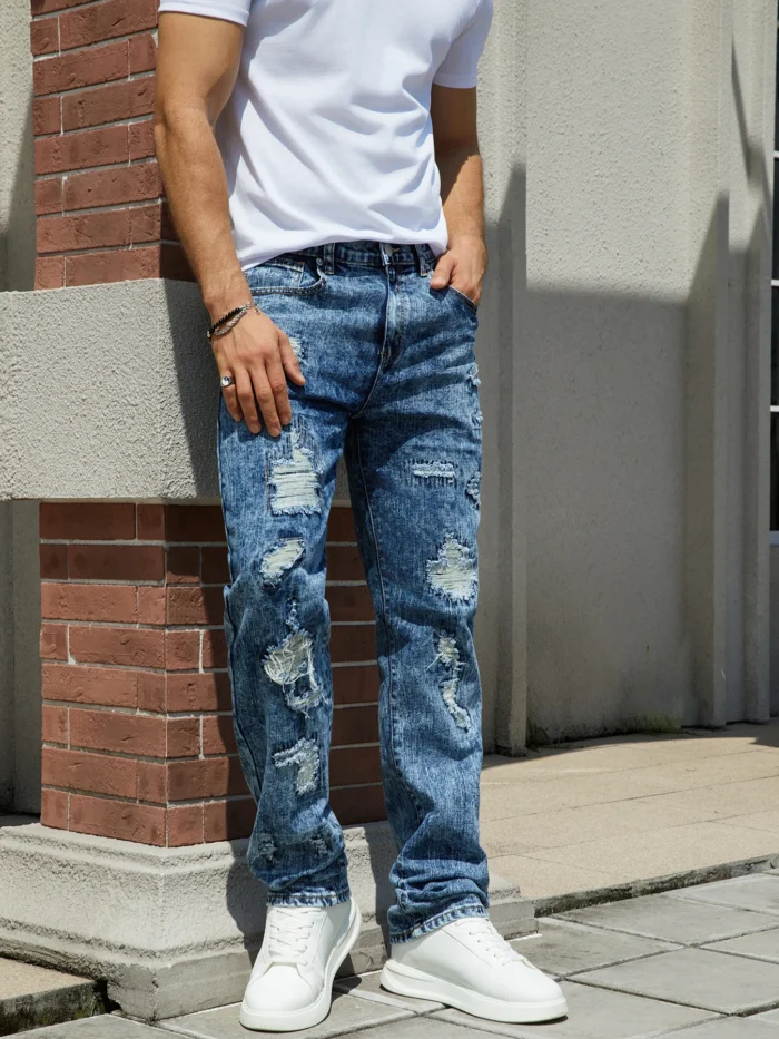 Men’s denim stretch pants, full of holes, trend stir-fried rinse water, embroidery car chaos, slim-fit style, street rock-121BLU