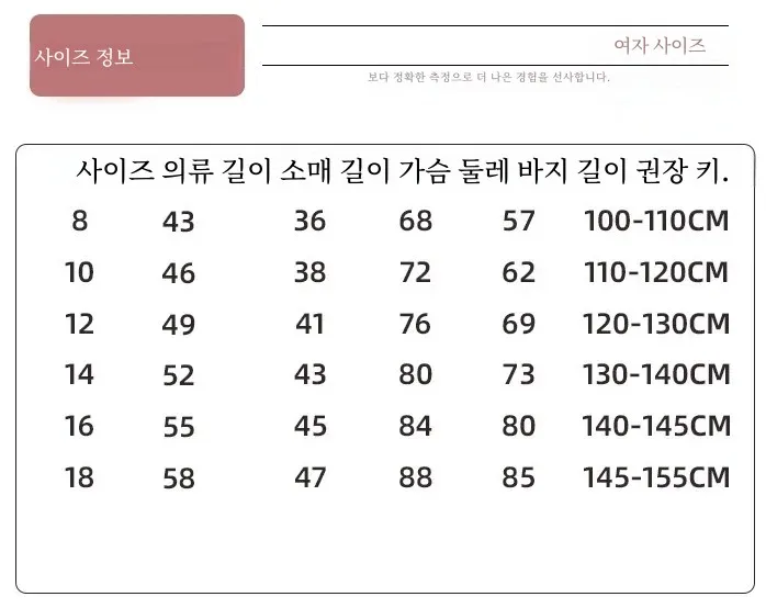 8size 95-105cm, 10size 105-115cm, 12size 115-125cm, 14size 125-135cm, 16size 135-145cm, 18size 145-155cm