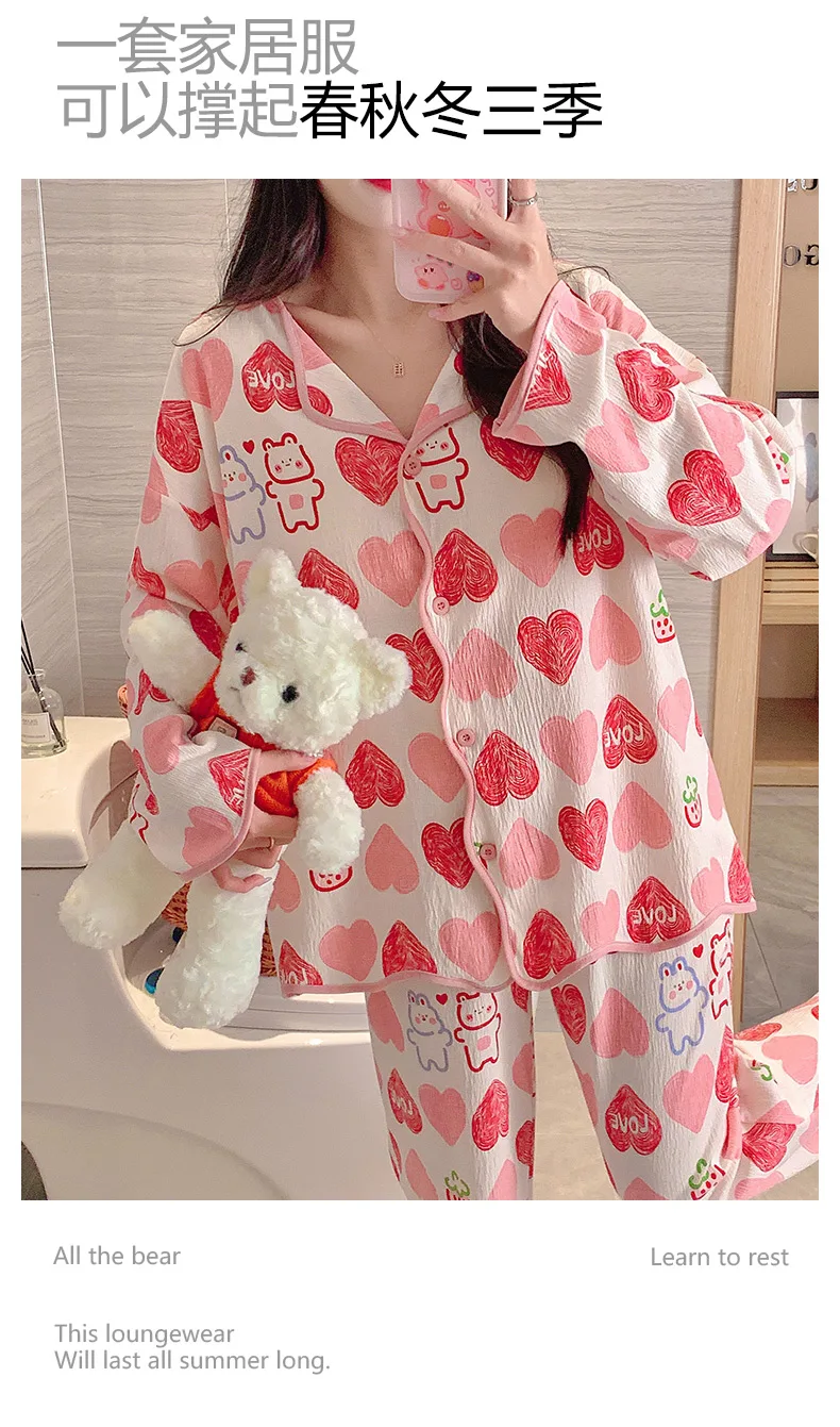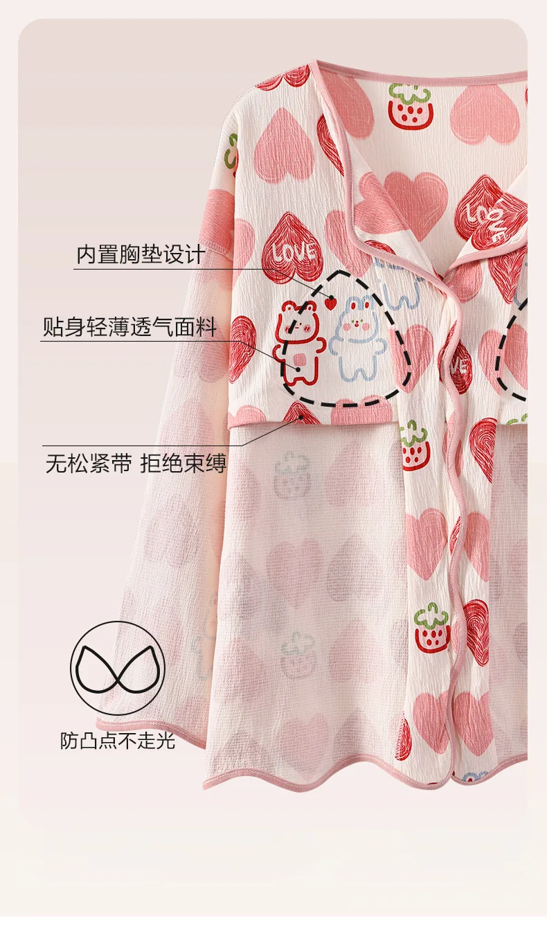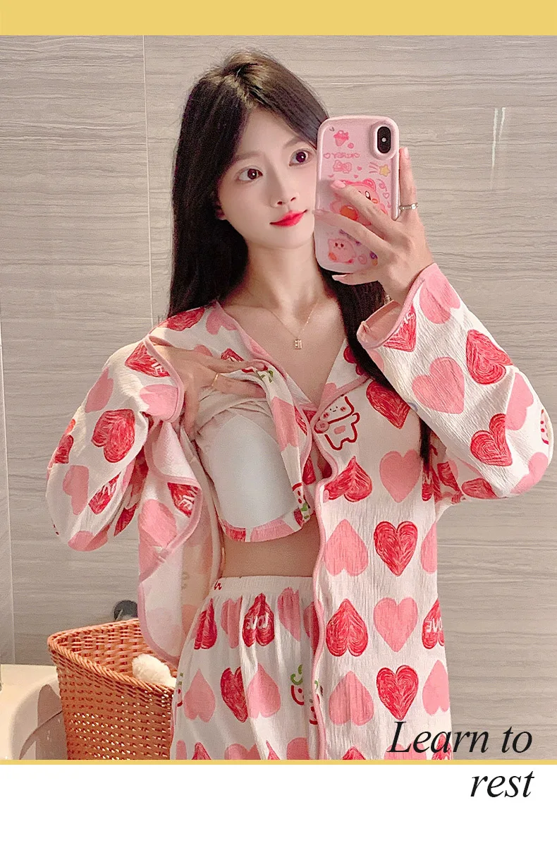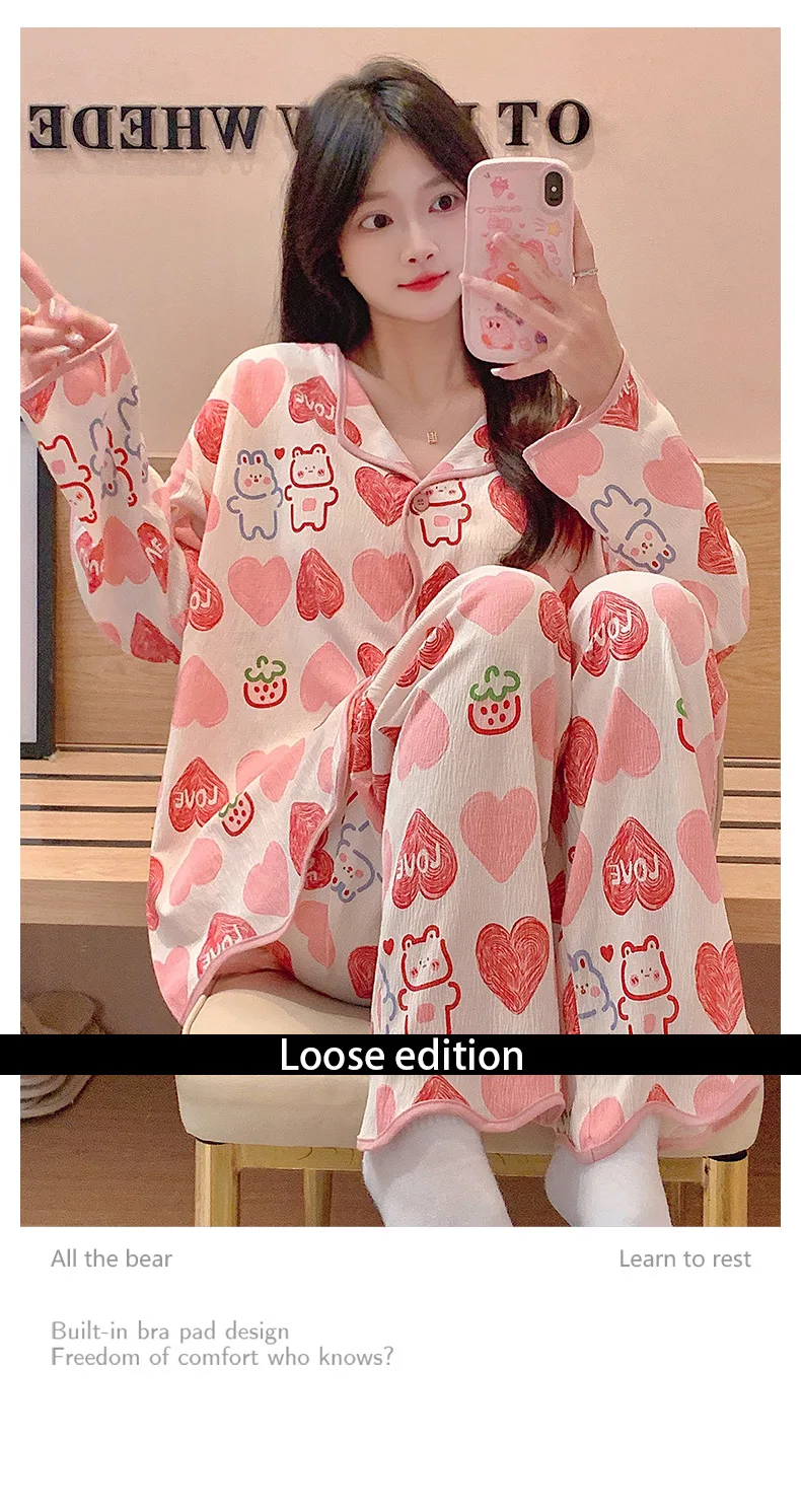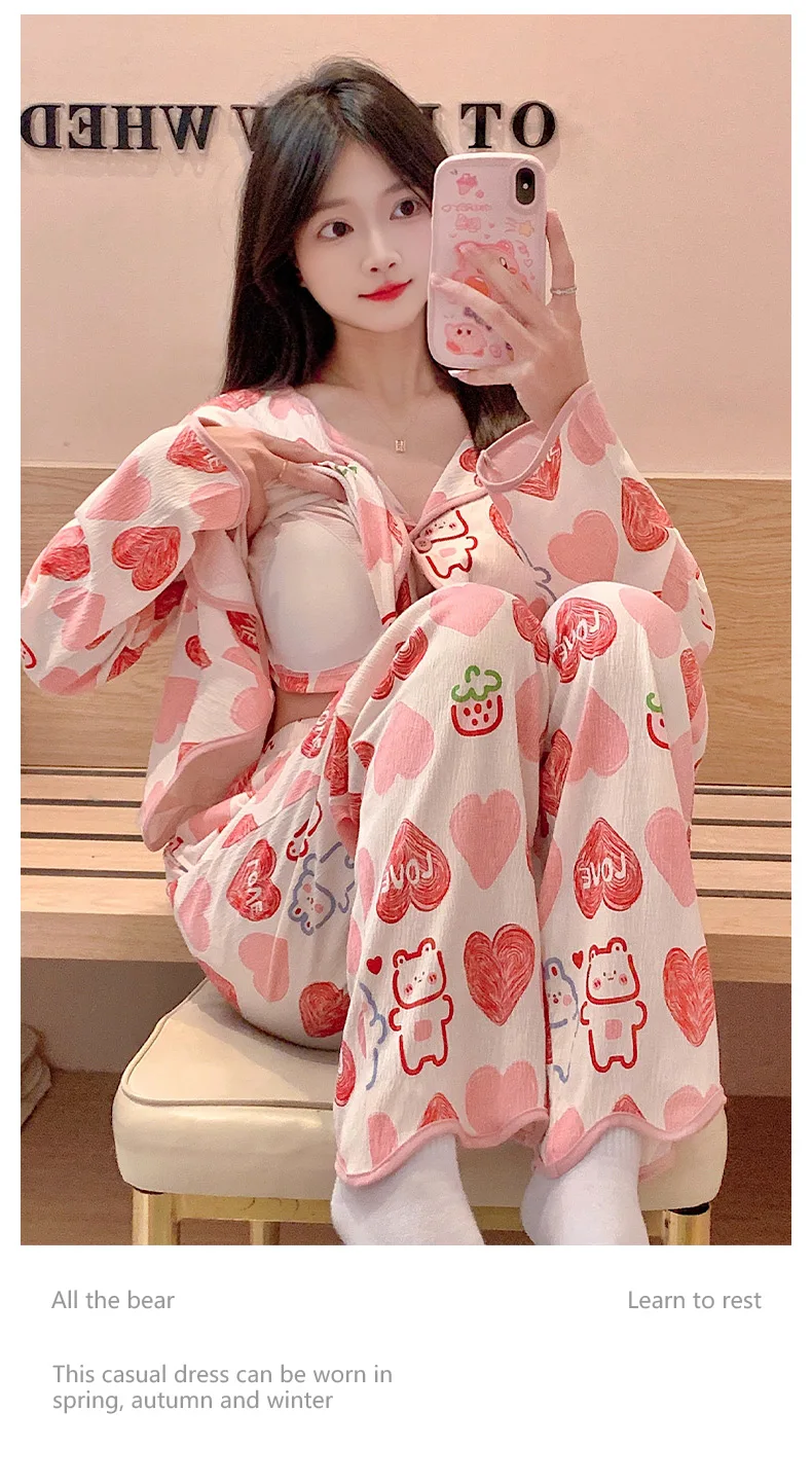 New Autumn Cute Bear Print Pajamas for Girl Fashion Pajama with Bra Pads Long Sleeves Cardigan Sleepwear Soft Woman Nightwear