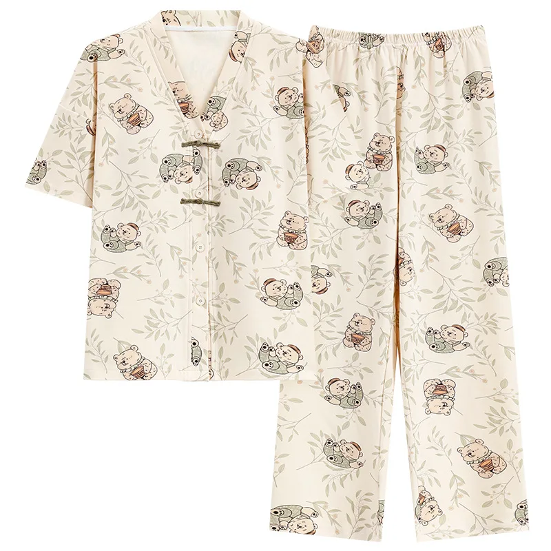 Pjs Women Cotton Pajama Style Sleepwear Pijamas Plus Size Nightwear Summer Women’s Short Sleeved Long Pants Cardigan Pajama Set