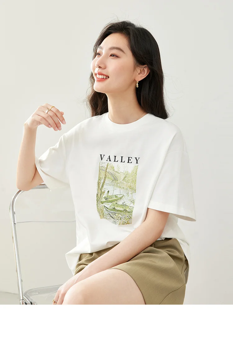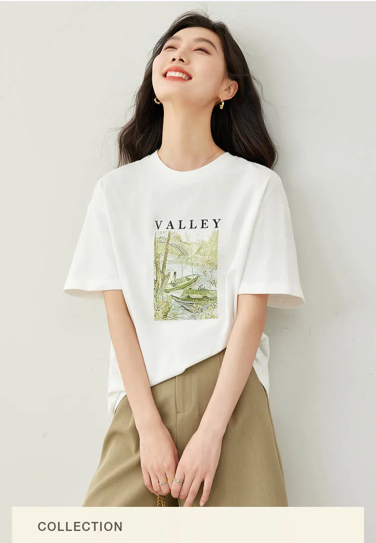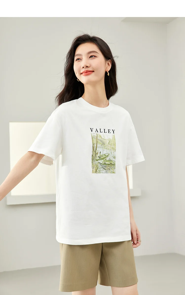 Vimly Cotton 100% White Printed T-shirts for Women 2024 Summer Short Sleeve Pullovers Casual Womens Top Female Clothes M6866
