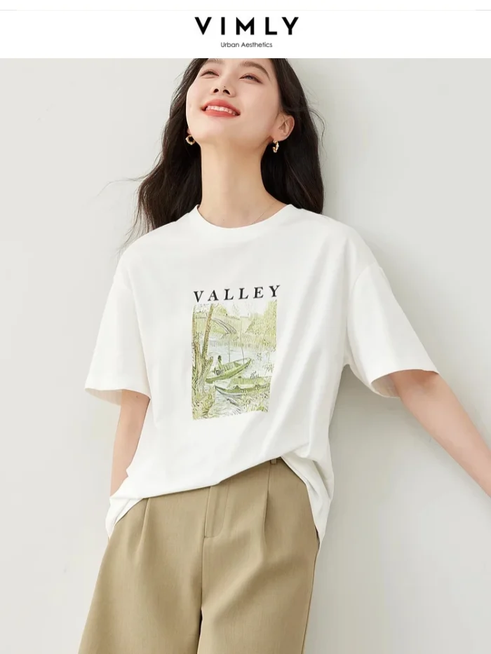 Vimly Cotton 100% White Printed T-shirts for Women 2024 Summer Short Sleeve Pullovers Casual Womens Top Female Clothes M6866