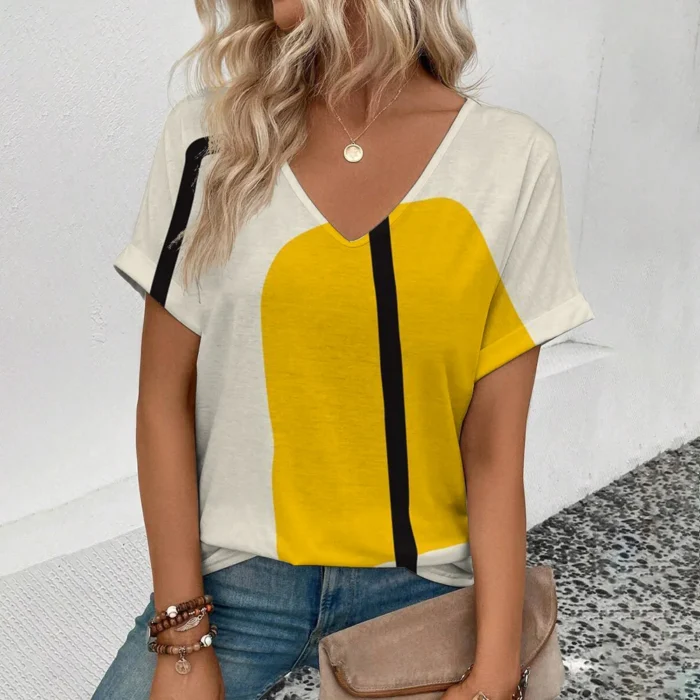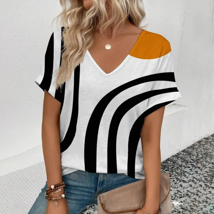 Women’s V-neck T-shirt Geometric Lines Pattern Print T-shirt Fashion Women’s Short Sleeved T-shirt 2024 Summer Leisure T-shirt